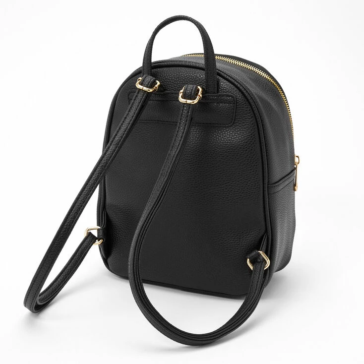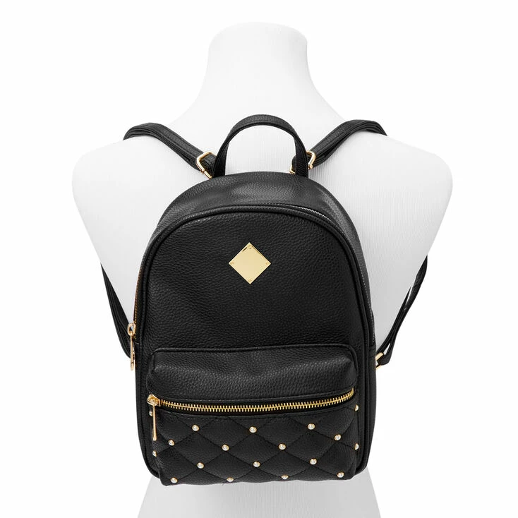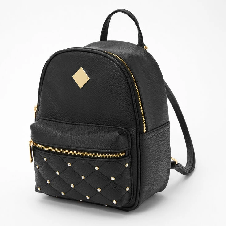 This stylish faux leather backpack has it all! Two zip compartments, adjustable straps, shiny gold accents, and pearl studs.