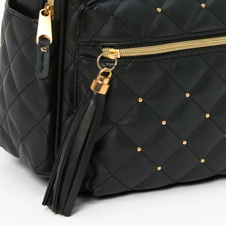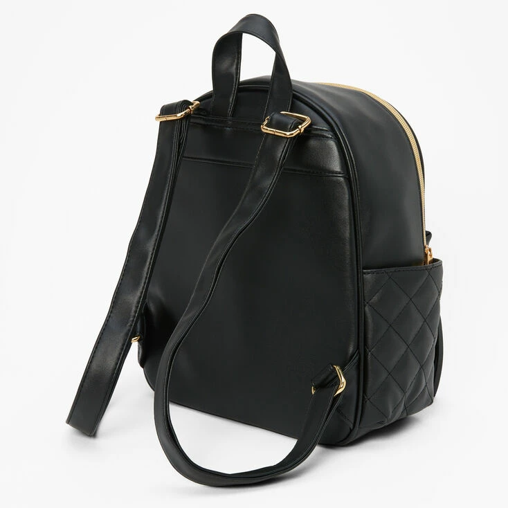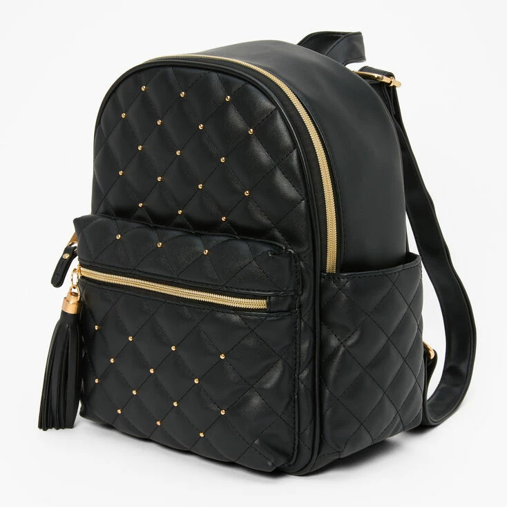 This stylish faux leather mini backpack has it all! Two zip compartments, adjustable straps, shiny gold accents, and gold pearl studs.