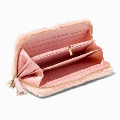 One little teddy bear face is all it takes to turn this wristlet from practical to adorable! The golden bear is nestled in the soft black sherpa that covers this handy accesory. Just loop it around your wrist and go! Unzip to find multiple sections, several slots for credit cards, and a zippered coin pouch. The strap unclips easily if you’d like to use it as a regular wallet instead.