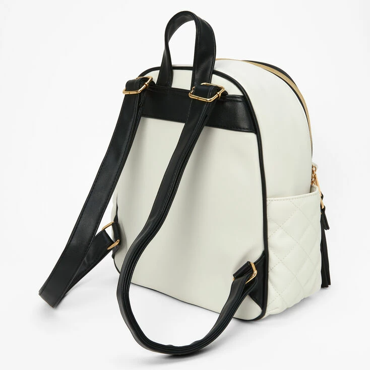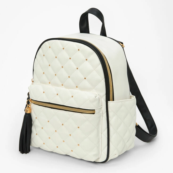 Classy white backpack features quilted stitching, gold-tone studs, and a decorative tassel. It has a roomy main compartment and a front zip pocket.